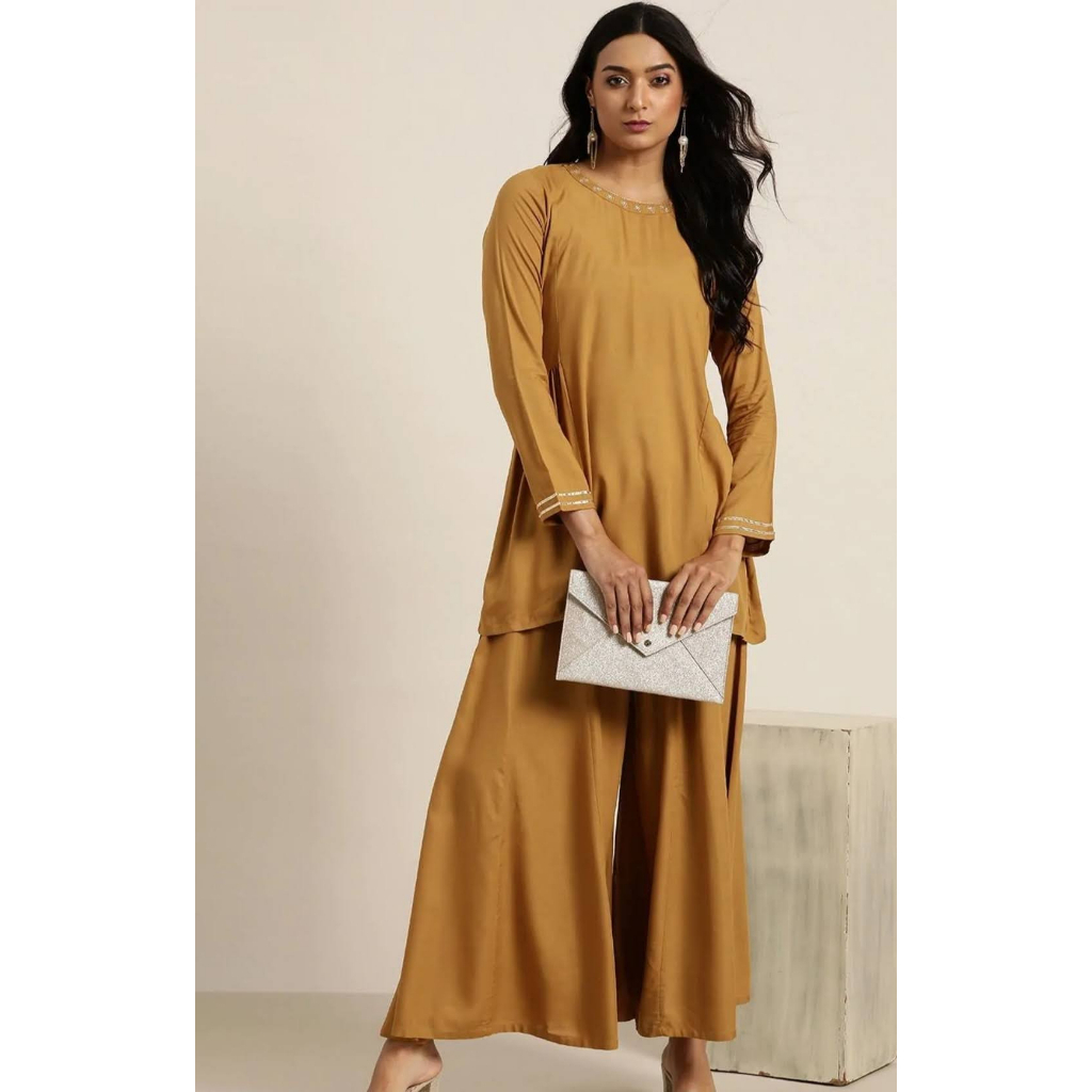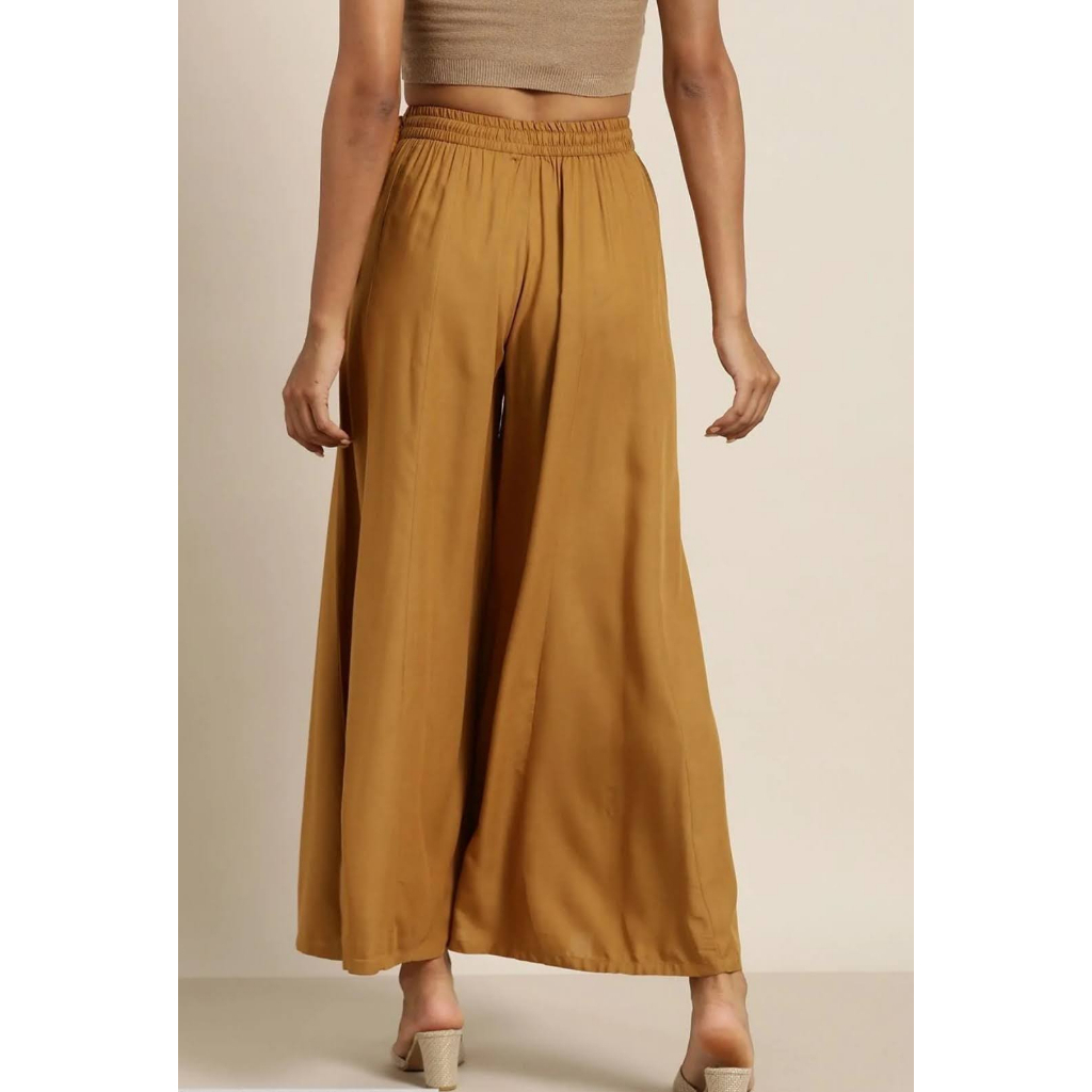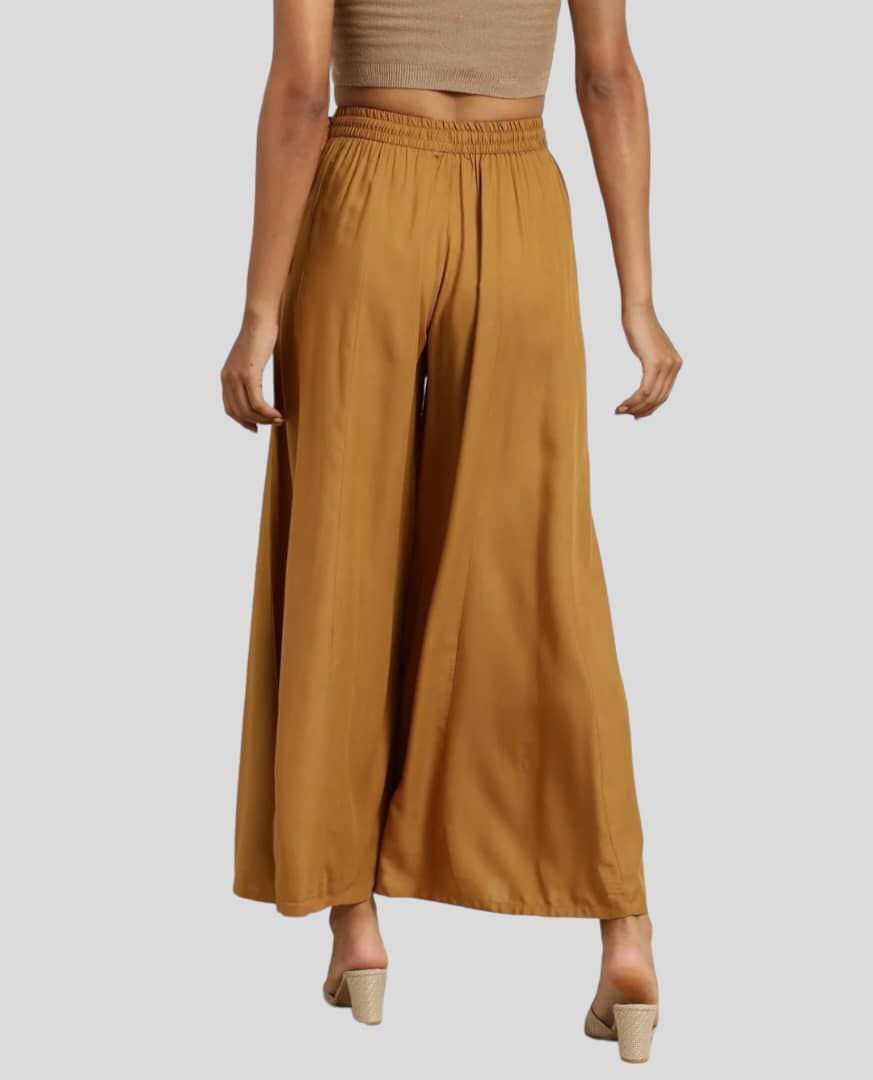 Material and Care: Liva ; Hand wash Style and Cut: Kali Palazzo Pattern: Solid Length : Full length Closure/Hemline : Elasticated waistband ; Flared Features : Kali Design Measurement: Size Waist hip XS 26 36 S 28 38 M 30 40 L 32 42 XL 34 44 2XL 36 46